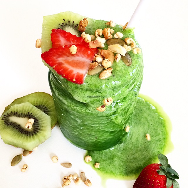 Blend: 2 stalks of kale, 1 frozen banana, 1 handful baby spinach, 1/2 kiwi, handful of mint, squeeze of lemon juice, 1/4 avocado, 1/2 cup coconut water, 1/2 cup coconut milk, 1 tbsp chia seeds.