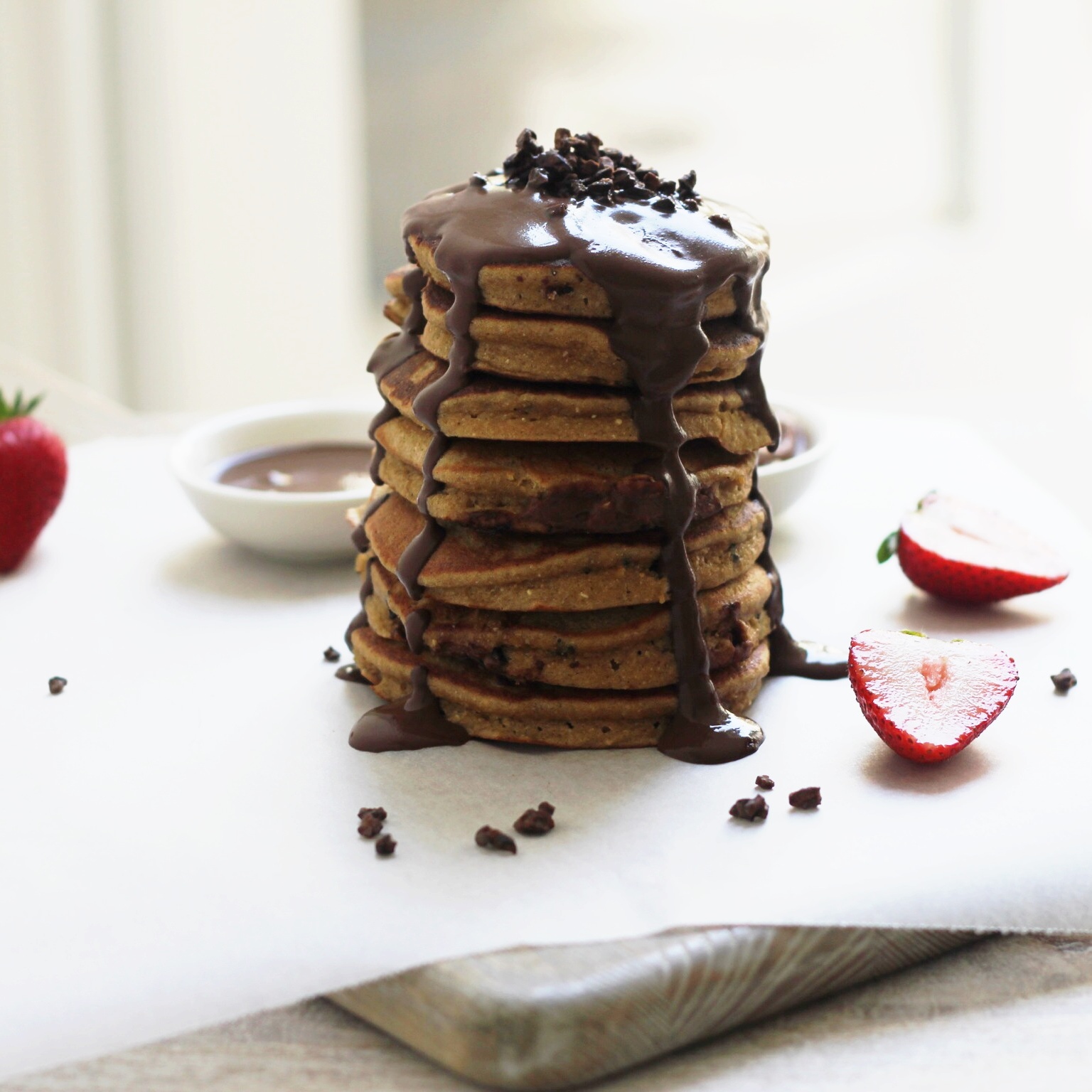 7. Serve the pancakes with the sauce, chocolate coyo, cacao nibs and strawberries. Absolutely to-die-for! A must-make.